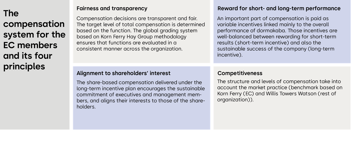 The compensation system of dormakaba reflects the commitment to attract, engage, and retain the best talent within the industry. It is designed to engage executives and employees to implement the company’s strategy, to achieve the company’s short-term and long-term business objectives, and to create sustainable shareholder value.