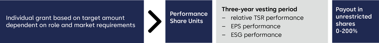 The PSU vest after a period of three years, subject to the achievement of performance conditions. The LTI performance indicators include relative Total Shareholder Return (TSR), Earnings per Share (EPS), and Sustainability (ESG) related targets. ESG targets have been introduced as from the grant 2023 to reflect the increasing importance of sustainability and cover both social and environmental topics that are addressed by our sustainability strategy.