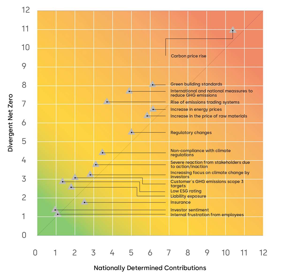 Long-term risks tend to have a higher significance and likelihood that they will occur. This is especially the case under the Divergent Net Zero scenario, where climate-related challenges are expected to be more severe. The exception is the “insurance” risk, which refers to disaster and catastrophe insurance premiums; they may be lower in a world where global warming has increased by only 1.5°C.