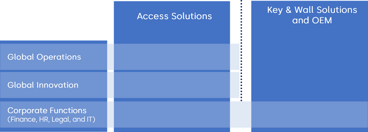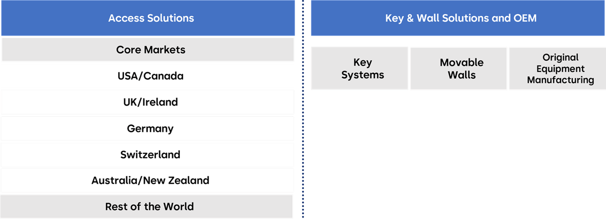 The organizational setup includes one further segment Key & Wall Solutions and OEM (KWO). It operates as a standalone and self-contained segment with three global businesses – Key Systems, Movable Walls, and Original Equipment Manufacturing (OEM). Production facilities for Key Systems and Movable Walls are situated in North and South America, Europe, and Asia. The OEM business has plants in mainland China and Taiwan.