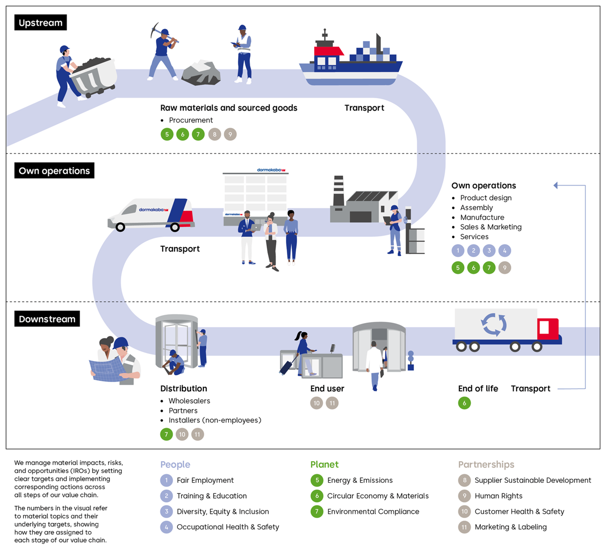 At dormakaba, sustainability is embedded throughout the entire value chain. From the sourcing of raw materials through the end-of-life of our products, we take a comprehensive approach to integrating responsible practices at every stage. This begins with upstream efforts, such as responsible procurement and active supplier engagement; continues through our own operations, including sustainable product design, environmentally conscious manufacturing, and the promotion of fair and safe working conditions; and extends to downstream activities focused on customer and end-user health and safety, as well as the circular handling of products at their end of life. Through this integrated approach, dormakaba is committed to reducing environmental impact, safeguarding human rights, and creating long-term value for all stakeholders.